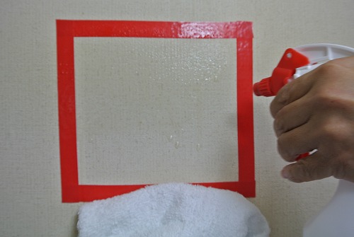 壁紙にスプレーヤーで洗浄液を噴霧し、ブラシで壁面をこすった後、ウエスにて拭き上げを行う