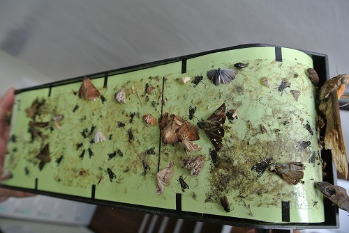 しかし、粘着版全面にはぎっしり足の踏み場(さらなる粘着)も無いほどに色々な虫が!夏休みの自由研究もこれで十分な感じです。