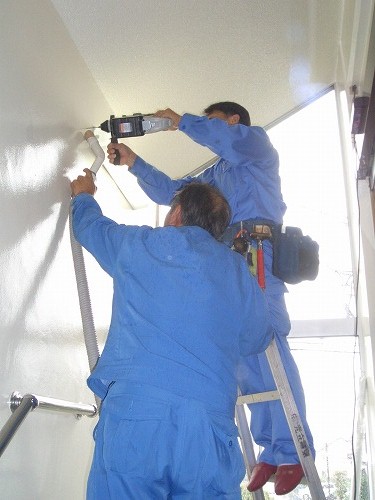 器具を安全に固定するためコンクリート壁にドリルで穴をあけます