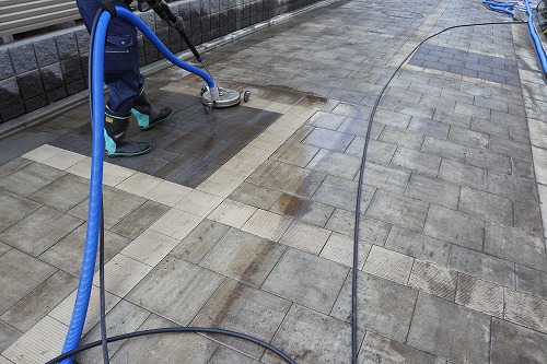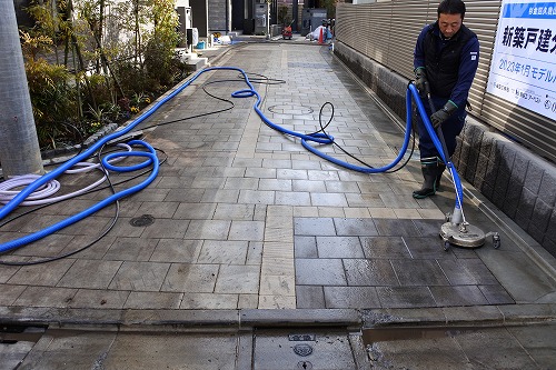 ホットジェブロフジヤマとサーフェースクリーナーによるインターロッキング洗浄