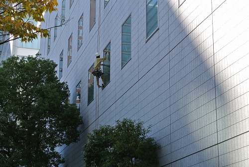 今回は写真のように、ロープによる高所のガラス清掃を行いました