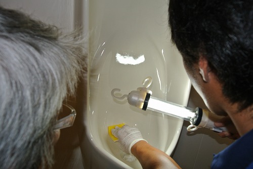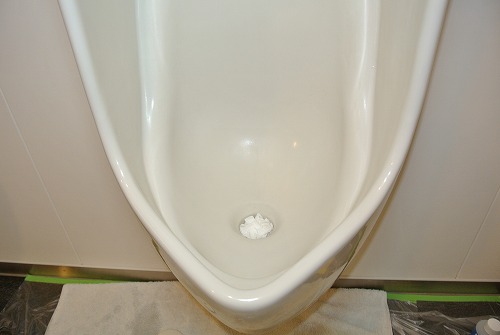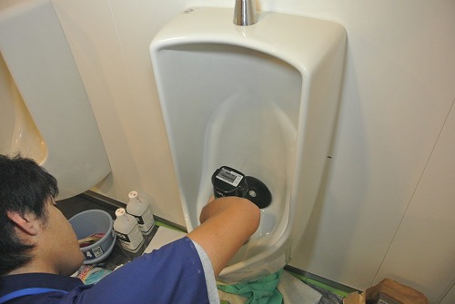 最初は余分な角質を除去する感じで、便器に専用の薬剤を塗布し洗浄を行い水垢や尿石の除去を行います、薬剤洗浄で除去できない部分は専用のダイアモンドパッドで表面を研磨しますが、便器の状態をよく見てダイアモンドパッドを目の粗いパッドから始めて、目の細かいパッドへと順番にかけていきます。作業工程の中で一番重要で時間のかかる作業となります。