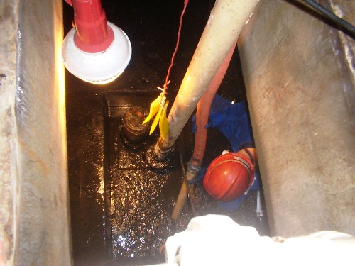 清掃中 槽内に入って清掃と異常個所のチェックです