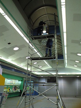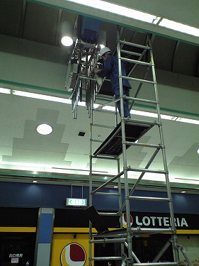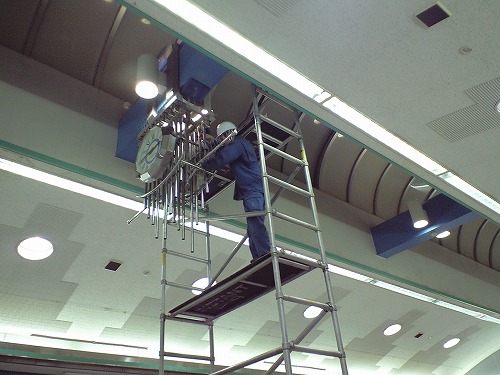写真でも確認できるとおり、時計は天井に吊るされているために、当然のことながら高所作業になります。