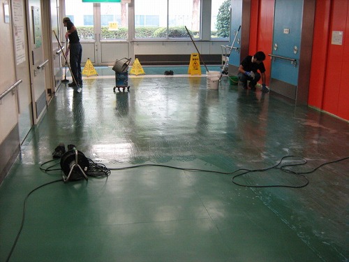 剥離洗浄は経年劣化して変色したワックスを、アルカリ性の強い剥離剤を塗布して分解し除去する作業です。