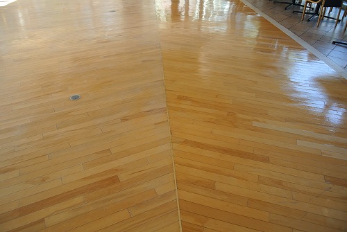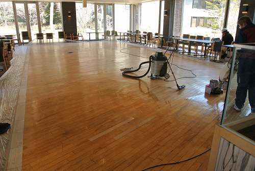 木床の塗布された古いワックスの剥離除去と、剥離後のフローリングへのワックス塗布作業です