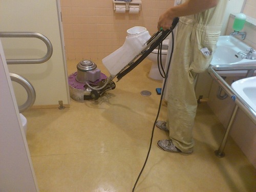 床材ビニールシートの表面を機械で丁寧に洗浄し、