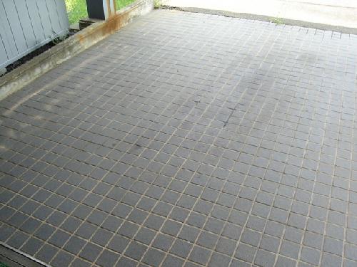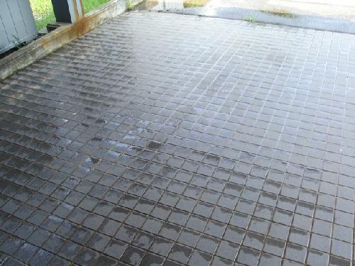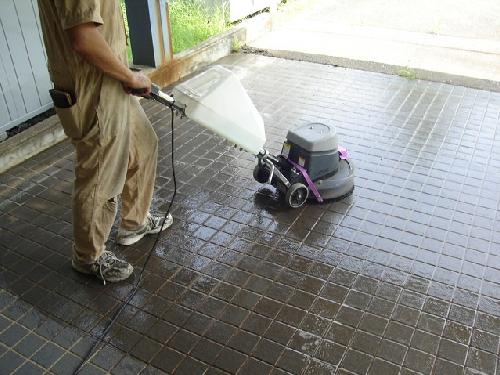 石タイルの洗浄は、土砂や埃を回収したのちに専用洗浄液を全面に塗布を行いまして、その後にナイロン素材のブラシで洗浄をかけます。
