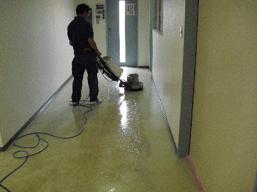 専用洗浄液を床面に塗布して汚れを浮かせまして、高速回転が可能のポリッシャーにパットを装着し削り落します。