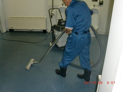 汚れを取り込んだ汚水を水取り専用のバキュームで回収後、床面をモップでよく拭き、乾燥させます。
