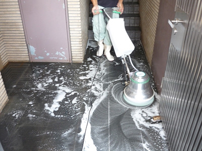 専用洗剤を塗布し、ポリッシャーで汚れを取り、バキュームで汚水を吸い上げ、モップで汚水が残らぬよう拭きまして工程終了となります。