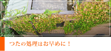 つたの処理はお早めに!育てば育つ程、除去作業が大変になる”つた”。また、つたによる建物へのダメージは無視出来ず、深刻なものです。このページではつたを放置すると建物にどの様に影響を与えるか。実例写真を元にご案内いたします。