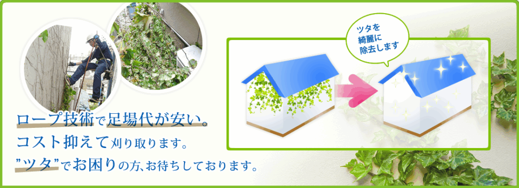 このサイトは株式会社東建社が運営しております。当社は清掃専門の会社です。長く清掃のお仕事を行ってきた中で、今回のサイトのテーマである「つた」にお困りの方が多い事を知り、この問題を解決しようと「つた除去専門サイト」を制作する事になりました。当社にご依頼いただく最大のメリットは「単管パイプによる足場を使わない、コストを大きく抑えたつた除去サービス」です。清掃作業で培ったロープ技術や、スライダーを駆使し、出来る限りコストを抑え、つた除去を実施いたします。一戸建て住宅から集合住宅、貸しビル等、幅広く対応出来ます。つたにお困りでしたら、お気軽にご連絡下さい。お待ちしております。