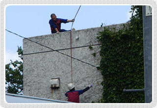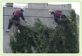 当社は普段、高層ビルのガラス清掃を行っております。ビルのガラス清掃にはロープ技術が必須です。当社はこの技術を活かし、つたの除去、剪定作業を行います。